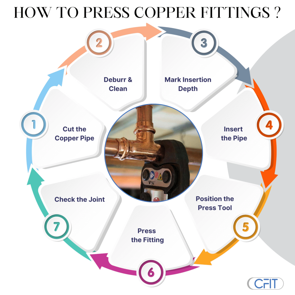 Copper fittings can be joined with a quick and non-flame process known as pressing copper fittings with the help of a special pressing tool. To start with, straighten the copper pipe with a pipe cutter then remove the burrs on the inside and outside edges. Wipe the surface of a pipe, make it clean of dirt or any debris. Pop the pipe completely into the press fitting until it reaches the right depth of insertion (it is advisable to mark the depth). Install the fitting by placing the correct size press jaw and start the press tool. The fitting is clamped very snug around the pipe by the tool to form an effective and leak-free joint. Avert the press mark and do the pressure testing when necessary.